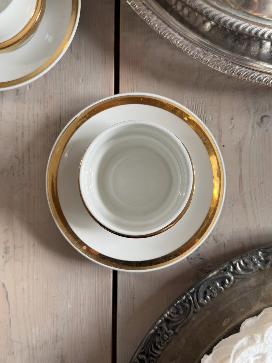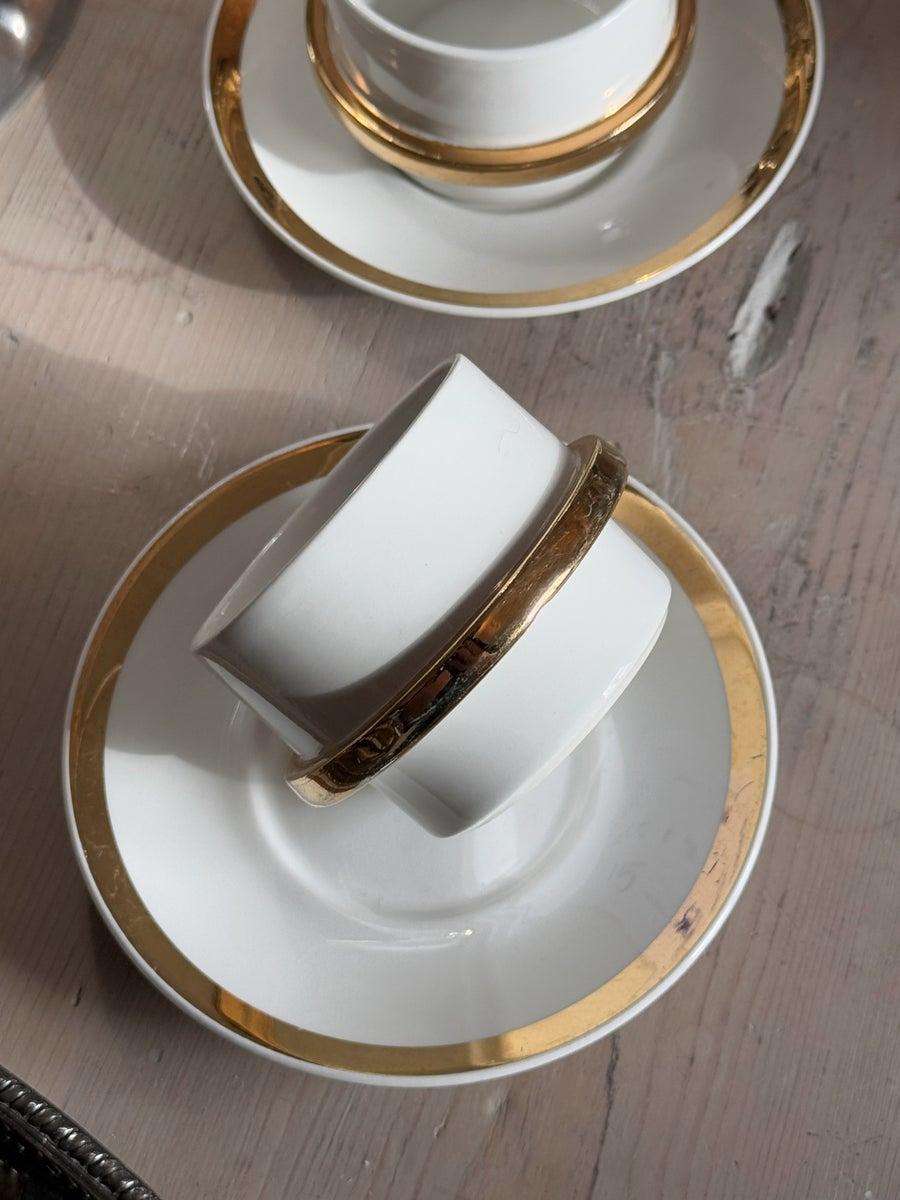 Göran Backin suunnittelema, Arabian kultavanne kuppi + aluslautanen. Hyväkuntoinen, kultaus ehjä mutta siinä on aavistus naarmua. Kupin halkaisija 7cm, korkeus 5cm, tassin halkaisija 12cm.